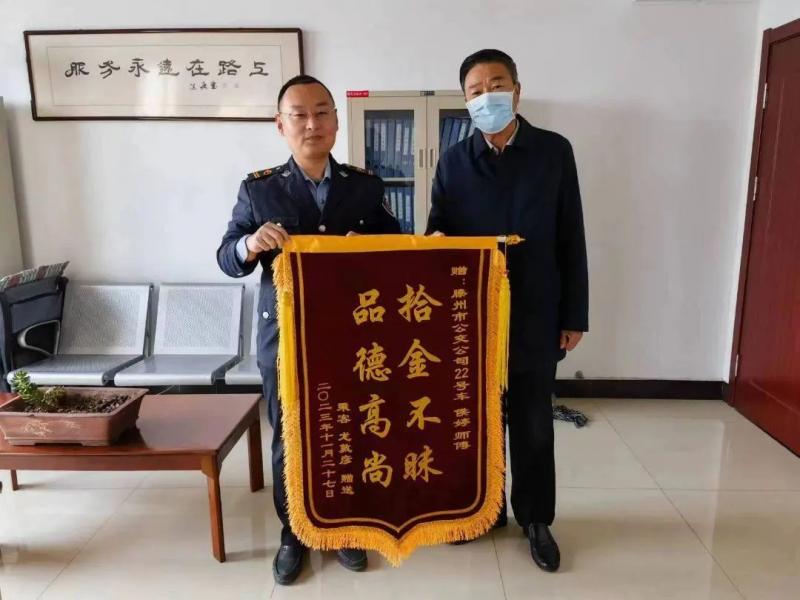 12月6日上午,市民龍先生專程來(lái)到交發(fā)集團(tuán)公交公司,將一面印有“拾金不昧 品德高尚”的錦旗交到公司工作人員手中,對(duì)22路駕駛員侯婷師傅表示感謝。